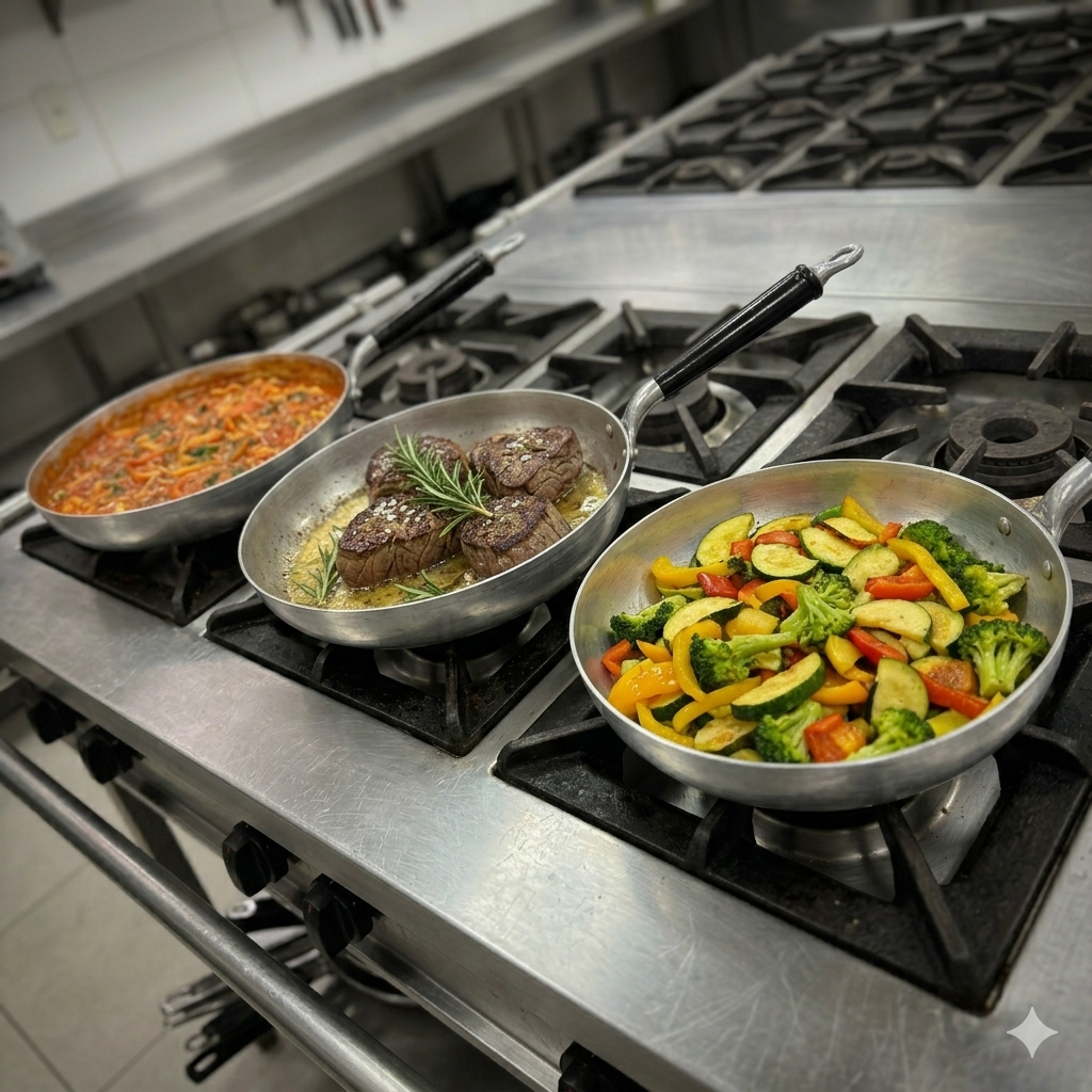 Qualidade profissional para sua cozinha com estas frigideiras da Linha Hotel. Produzidas em alumínio de alta resistência, são ideais para uso intenso em cozinhas industriais, restaurantes ou no dia a dia, garantindo preparo rápido e uniforme dos alimentos.